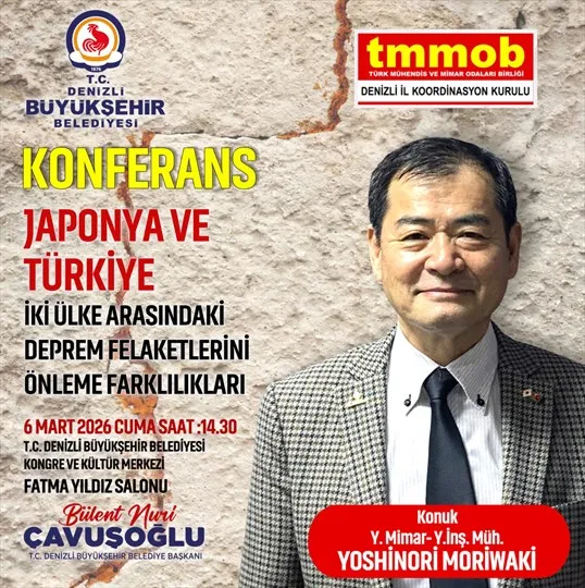 Denizli Büyükşehir Belediyesi, Türk Mühendis ve Mimar Odaları Birliği (TMMOB) Denizli İl Koordinasyon Kurulu ile iş birliği yaparak, Yüksek Mimar ve Yüksek İnşaat Mühendisi Yoshinori Moriwaki'nin konuşmacı olacağı "Japonya ve Türkiye: İki Ülke Arasındaki Deprem Felaketlerini Önleme Farklılıkları" başlıklı bir konferans düzenleyecek.