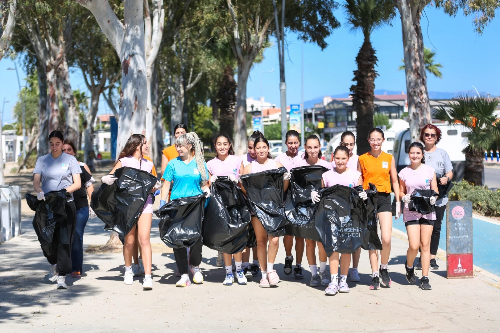 İzmir Narlıdere Belediyespor Kız Voleybol Takımı sporcuları, "temiz bir çevre, sağlıklı bir gelecek" sloganıyla Narlıdere sahilinde kıyı temizliği yaptı