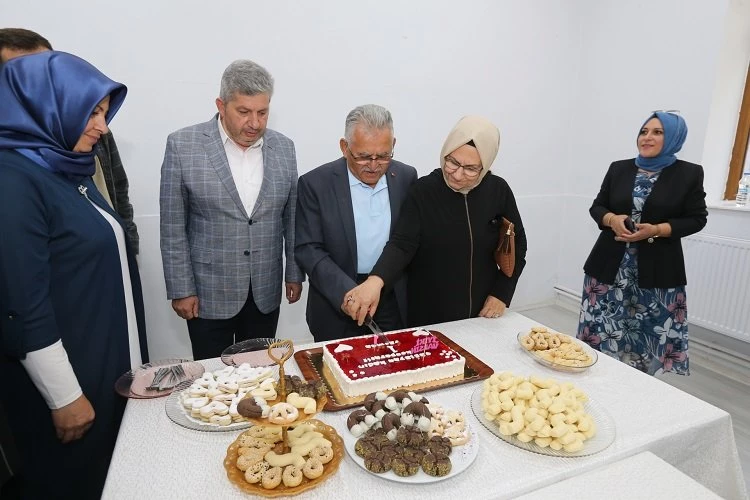 Kayseri'nin Bünyan ilçesinde kadın kooperatiflerini ziyaret eden Büyükşehir Belediye Başkanı Dr. Memduh Büyükkılıç, Çağlayan Kadın Kooperatifi'nin 1'inci yıldönümüne özel hazırlanan gilaburulu pastayı eşi Dr. Necmiye Büyükkılıç ile keserek, tadına baktı.