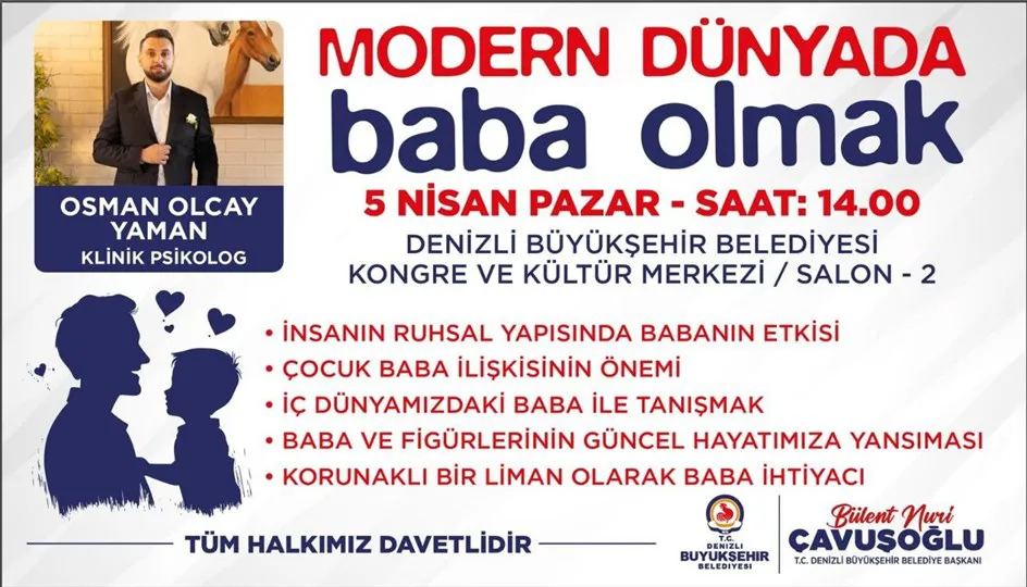 Denizli Büyükşehir Belediyesi, 'Modern Dünyada Baba Olmak' başlıklı bir seminerle babalar ve baba adaylarını uzmanlarla buluşturacak. Etkinlik 5 Nisan Pazar günü gerçekleşecek.
