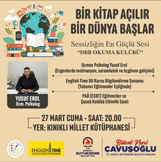Denizli Büyükşehir Belediyesi, kültür ve eğitim faaliyetleri kapsamında yeni bir etkinlik başlatıyor. Büyükşehir Millet Kütüphanesi, 27 Mart Cuma günü saat 20.00'de "DBB Okuma Kulübü" programına ev sahipliği yapacak.