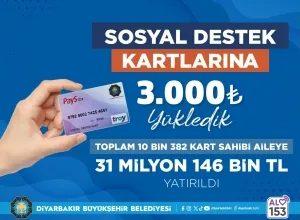 Diyarbakır Büyükşehir Belediyesi, aralık ayında ihtiyaç sahibi 10 bin 382 yurttaşın SODES Kartına kişi başı 3 bin TL yatırdı. Toplam destek tutarı 31 milyon 146 bin TL'ye ulaştı.