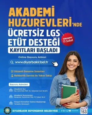 Diyarbakır Büyükşehir Belediyesi, Akademi Huzurevleri Etüt Merkezi'nde LGS sınavına hazırlanan öğrenciler için ücretsiz etüt programı başlattı. Başvurular 13 Şubat'a kadar devam edecek.
