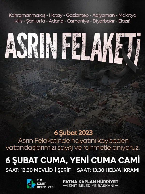 İzmit Belediyesi, 6 Şubat 2023 tarihinde Kahramanmaraş merkezli meydana gelen ve 11 ili etkileyen depremde hayatını kaybeden vatandaşları anmak amacıyla Mevlid-i Şerif programı düzenliyor.