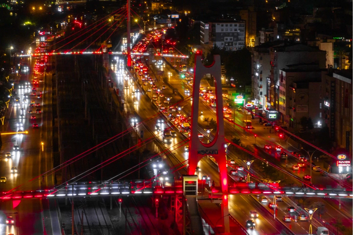 Kocaeli Büyükşehir Belediyesi, kentin sembolleşmiş üst geçitlerini al bayrağın renkleriyle ışıklandırdı.
