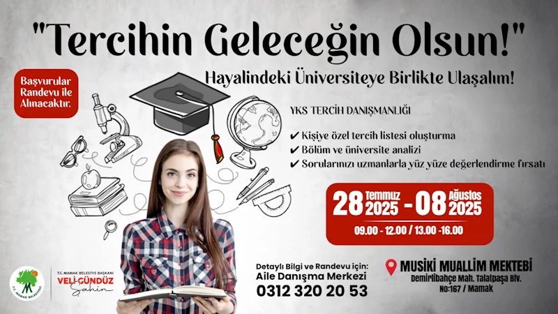 Mamak Belediyesi Aile Danışma Merkezi Psikolojik Danışmanı Zeynep Bektaş ve Eğitim Danışmanı Büşra Urhan tarafından yürütülecek programda, öğrencilere kişiye özel tercih listesi oluşturma, bölüm ve üniversite analizleri gibi konularda detaylı rehberlik sağlanacak. Saat 09.00 – 12.00 ve 13.00 – 16.00 saatleri arasında yürütülecek danışmanlık süreci için başvurular Aile Danışma Merkezi üzerinden randevu alınarak gerçekleştirilecek.