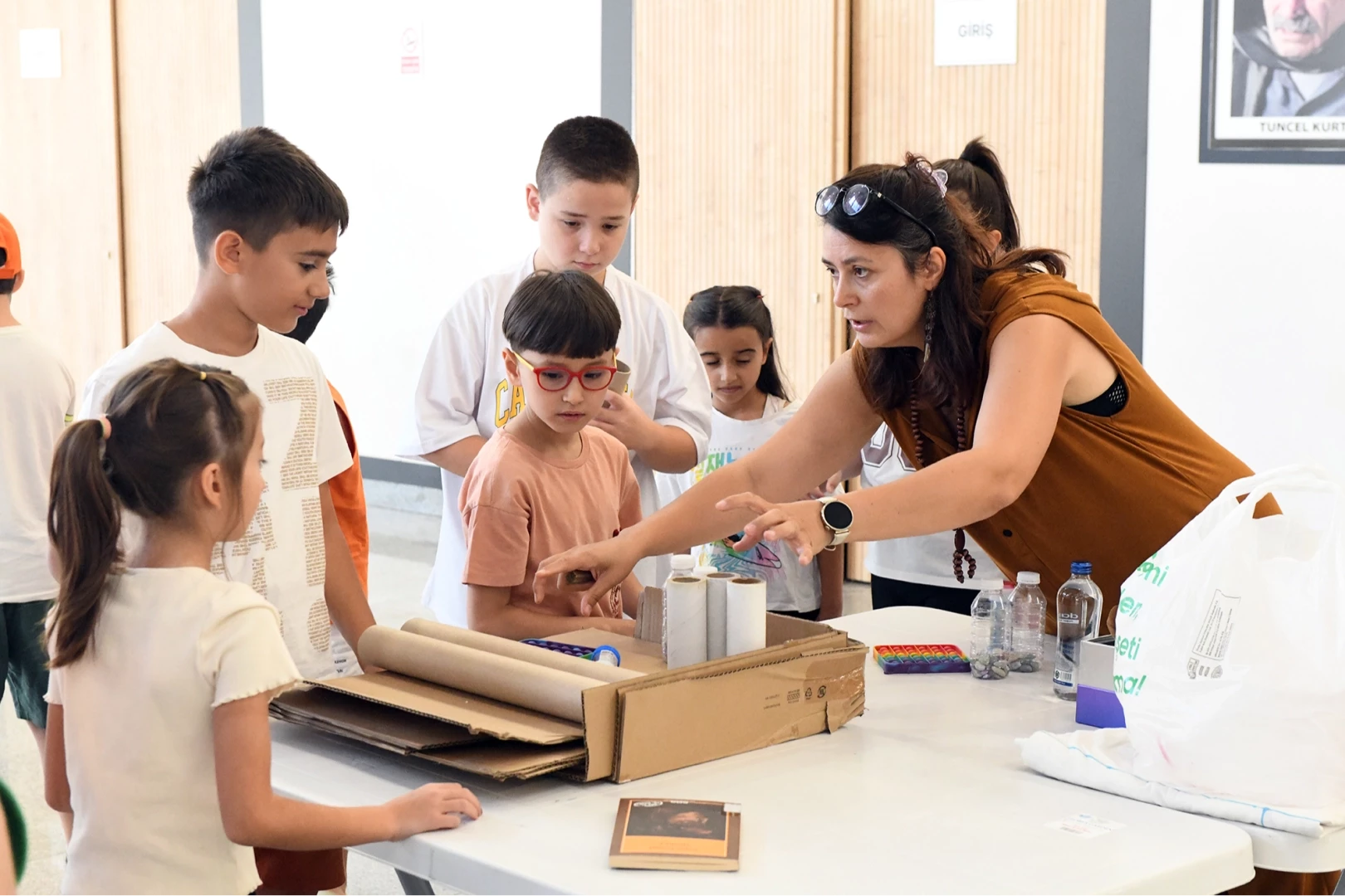 Etkinliği yöneten Yaratıcı Drama ve Özel Eğitim Öğretmeni Gülşah Günay, çalışmanın amacının çocuklara hem doğa bilinci hem de iş birliği kültürü kazandırmak olduğunu belirterek, “Yaşar Kemal’in Teneke isimli eserinden yola çıkarak bir toprak atölyesi gerçekleştirdik. Eserde sivrisineklerle mücadele eden, çeltik tarlaları olan bir köyün dönüşümünü ve adalet duygusunu işliyoruz. Drama canlandırmaları yaptık, ritim aletleri ürettik, çocuk yogası ile denge çalıştık, resim yaptık. Çoraptan sivrisinek yapma etkinliğimizde ise kitaptaki köyde yaşanan sivrisinek sorununa gönderme yaptık. Parkur etkinliği ile özgüvenlerini artırmayı ve takım çalışmasını güçlendirmeyi hedefledik. Tüm malzemeler geri dönüştürülebilir materyallerden seçildi” dedi.