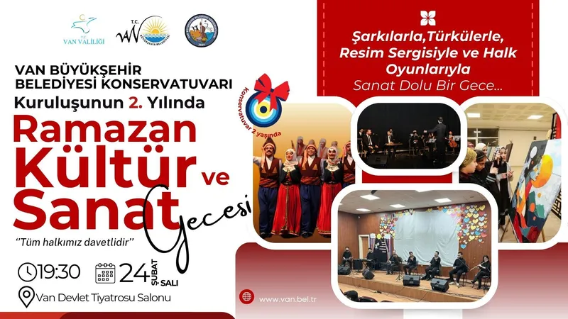 Van Büyükşehir Belediyesi Kültür, Sanat ve Sosyal İşler Dairesi Başkanlığı Konservatuvarı, kuruluşunun ikinci yılı dolayısıyla "Ramazan Kültür ve Sanat Gecesi" programı düzenleyecek. Program, Ramazan ayının manevi atmosferinde vatandaşlara kültür ve sanatı bir arada sunmayı hedefliyor.