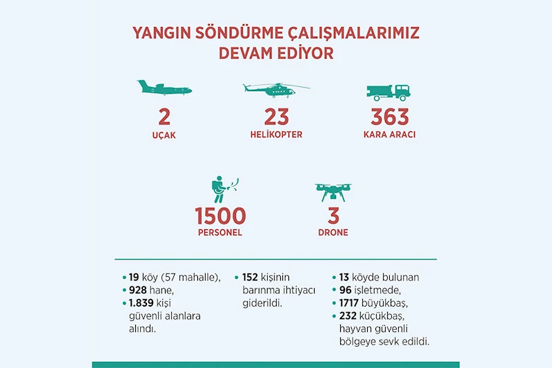 Zorlu arazi şartları ve rüzgâra rağmen yangınla mücadele havadan ve karadan devam ediyor.