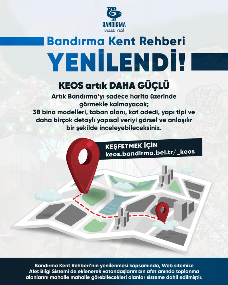 Bandırma Belediyesi'nin dijital kent rehberi yenilendi. Sistem, 3 boyutlu bina verileri ve mahalle bazlı afet toplanma alanlarını görüntüleme özelliği kazandı.
