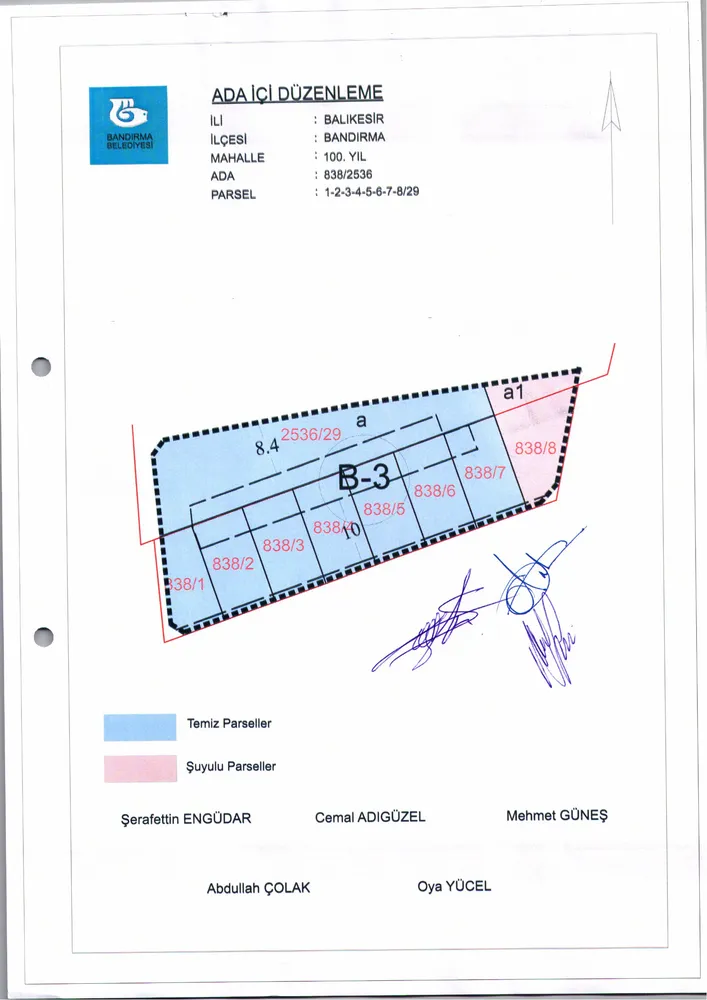 Bandırma Belediyesi Encümeni, 25.03.2026 tarih ve 370 sayılı kararı ile 100. Yıl Mahallesi'nde bulunan 838 ada, 1-2-3-4-5-6-7-8 numaralı parseller ile 2536 ada 29 nolu parsele ait ada içi düzenlemesinin onaylanmasına karar verdi.
