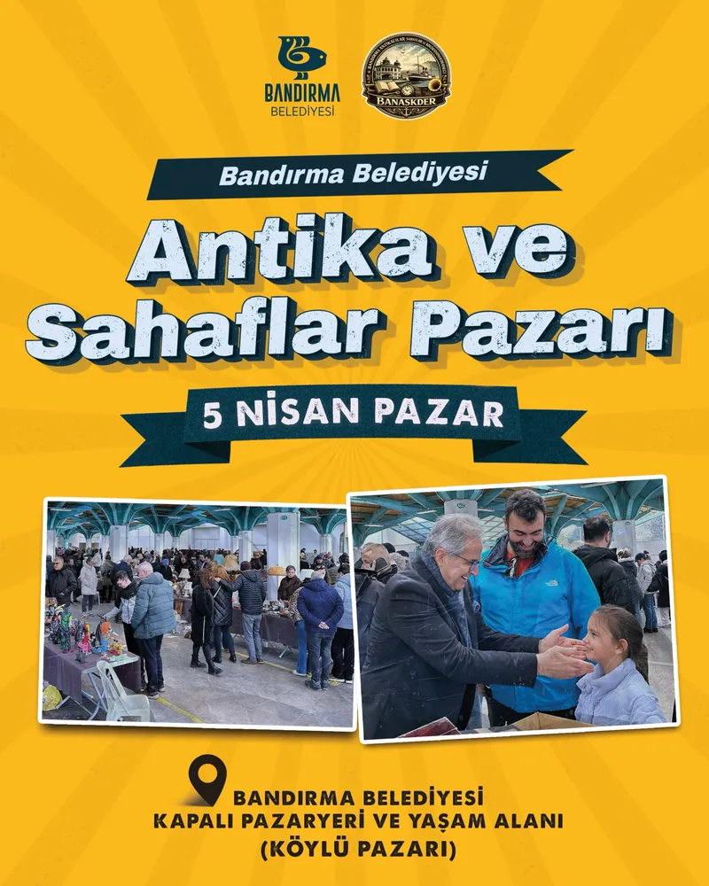 Bandırma Belediyesi ve BANASKDER iş birliğiyle düzenlenen pazarda antika eşyalar, nadir kitaplar ve plaklar sergileniyor. Etkinlik 5 Nisan Pazar günü gerçekleştirilecek.