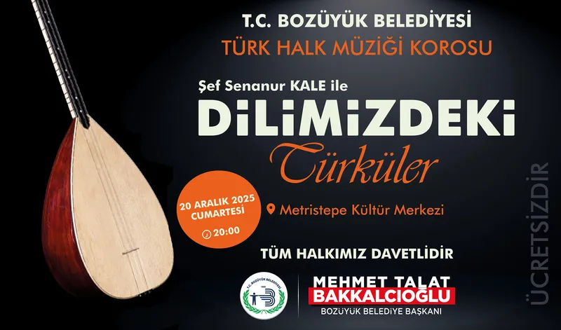Bozüyük Belediyesi Türk Halk Müziği Korosu, 20 Aralık 2025 Cumartesi akşamı Metristepe Kültür Merkezi'nde ücretsiz bir konser verecek.