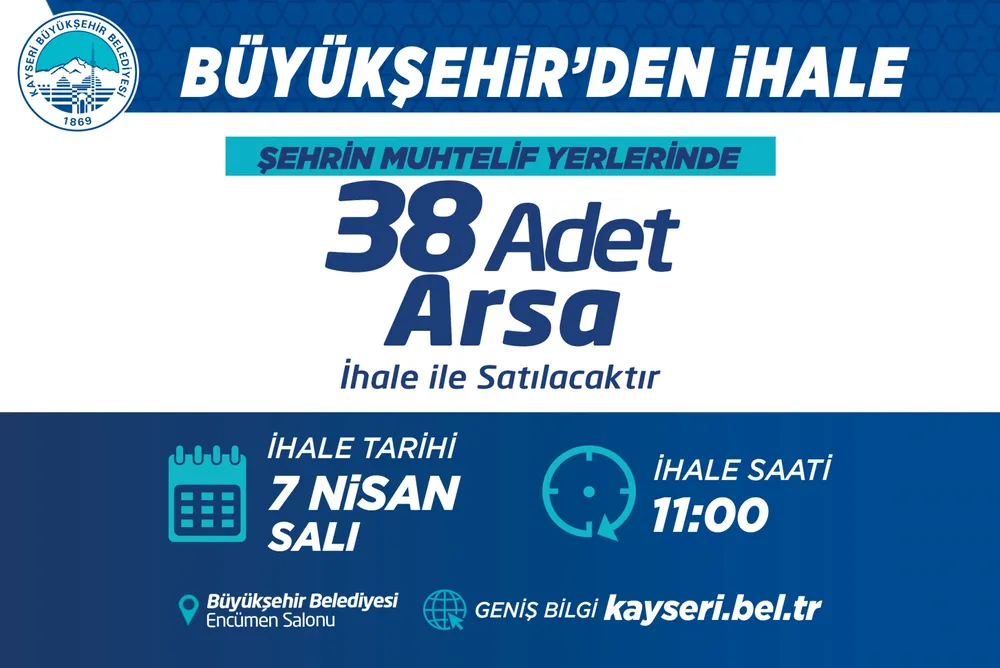 Kayseri Büyükşehir Belediyesi, şehrin muhtelif yerlerinde bulunan 38 adet arsayı 7 Nisan Salı günü satışa çıkaracak. İhaleler kapalı ve açık teklif usulüyle gerçekleştirilecek.