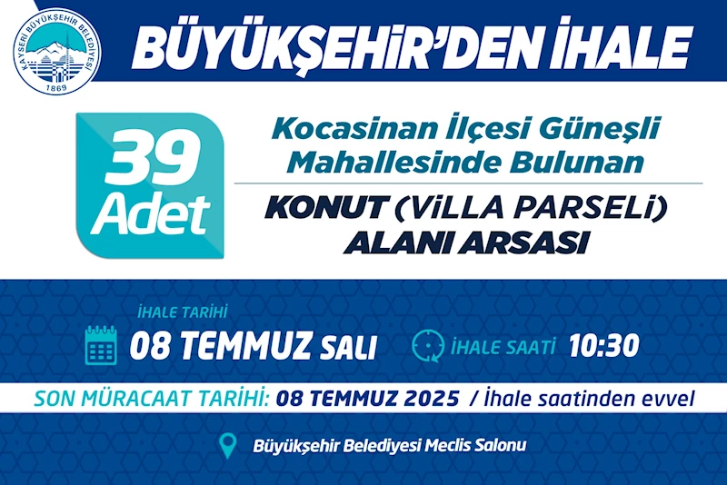 Mülkiyeti Kayseri Büyükşehir Belediyesi’ne ait olan Kocasinan ilçesi Güneşli Mahallesi’nde bulunan 39 adet konut arsası alanı, “Açık Teklif Usulü” ihale ile satışa çıkarılacak.