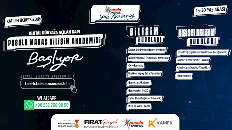 Kahramanmaraş Büyükşehir Belediyesi, “Pusula Maraş” markasıyla gençlere yönelik faaliyetlerini artırarak sürdürüyor. Gençlerin yaz tatilini hem verimli hem de keyifli bir şekilde değerlendirebilmesi için yeni bir eğitim programı daha hayata geçiriliyor: Pusula Maraş Yaz Akademisi. 15 – 30 yaş aralığındaki gençlere yönelik olarak hazırlanan Yaz Akademisi’nde, bilişim teknolojileri ve kişisel gelişim alanlarında birbirinden değerli eğitimler ücretsiz olarak sunulacak. KAMEK bünyesinde düzenlenecek akademide; masaüstü yayıncılık, GameLab, üretken yapay zekâ temelleri, GameStar Akademi, uygulamalı ileri düzey fotoğrafçılık, yaratıcı drama ve Hitabet Hane gibi branşlarda eğitimler verilecek. Büyükşehir Belediyesinden yapılan açıklamada, eğitimlerin ücretsiz olduğu vurgulanırken, kurslara katılmak isteyen gençlerin https://kahramanmaras.bel.tr/duyuru/2025/06/24/pusula-maras-yaz-akademisi-basvuru-formu adresinden çevrimiçi başvuru yapabileceği belirtildi. Kahramanmaraşlı gençlere hem akademik hem de kişisel gelişim alanında katkı sağlaması hedeflenen Pusula Maraş Yaz Akademisi hakkında detaylı bilgiye 0552 768 90 50 numaralı WhatsApp hattından ulaşılabileceği ifade edildi.