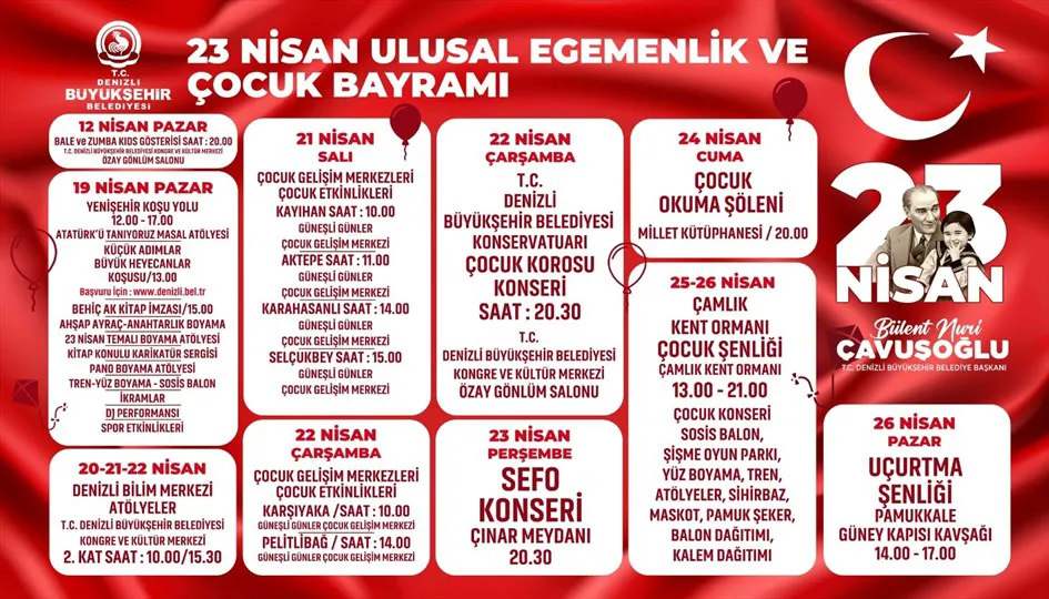 Denizli Büyükşehir Belediyesi, 23 Nisan Ulusal Egemenlik ve Çocuk Bayramı'nı 12-26 Nisan tarihleri arasında konserler, atölyeler, şenlikler ve sportif faaliyetlerden oluşan kapsamlı bir programla kutlamaya hazırlanıyor.